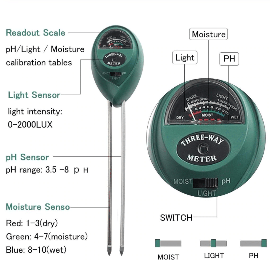 3-IN-1 SOIL TEST KIT: You can measure soil moisture, ph value Test and sunlight intensity. This will be a good set of plant moisture meter for your garden courtyard, helping your plants to be healthier