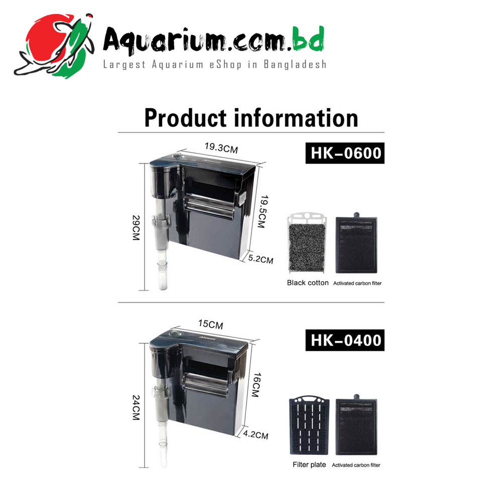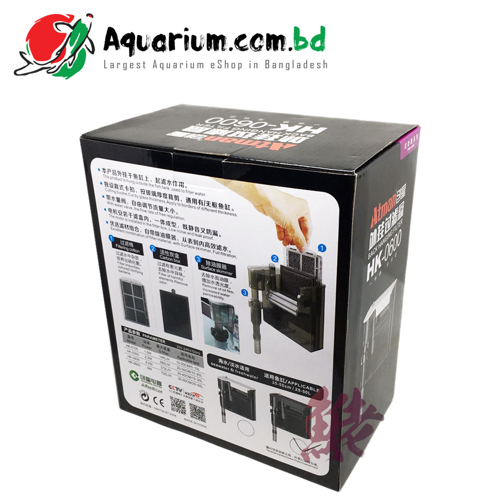 | Atman | Back Hanging Filter HK-0600 | This product is hung outside the fish tank, used to filter water | 720L/H | 6W | 1 kg |