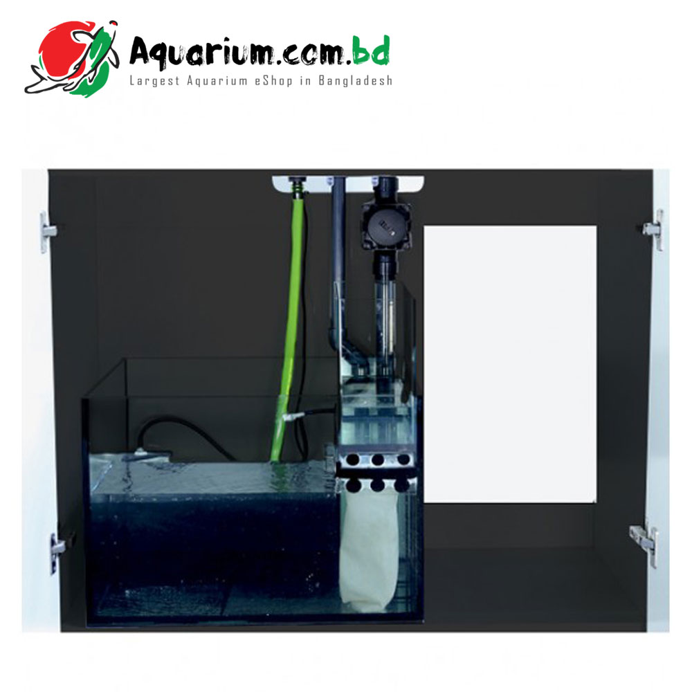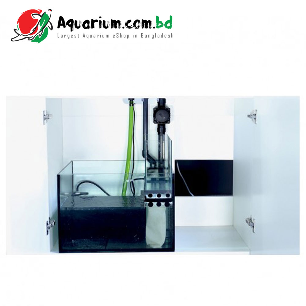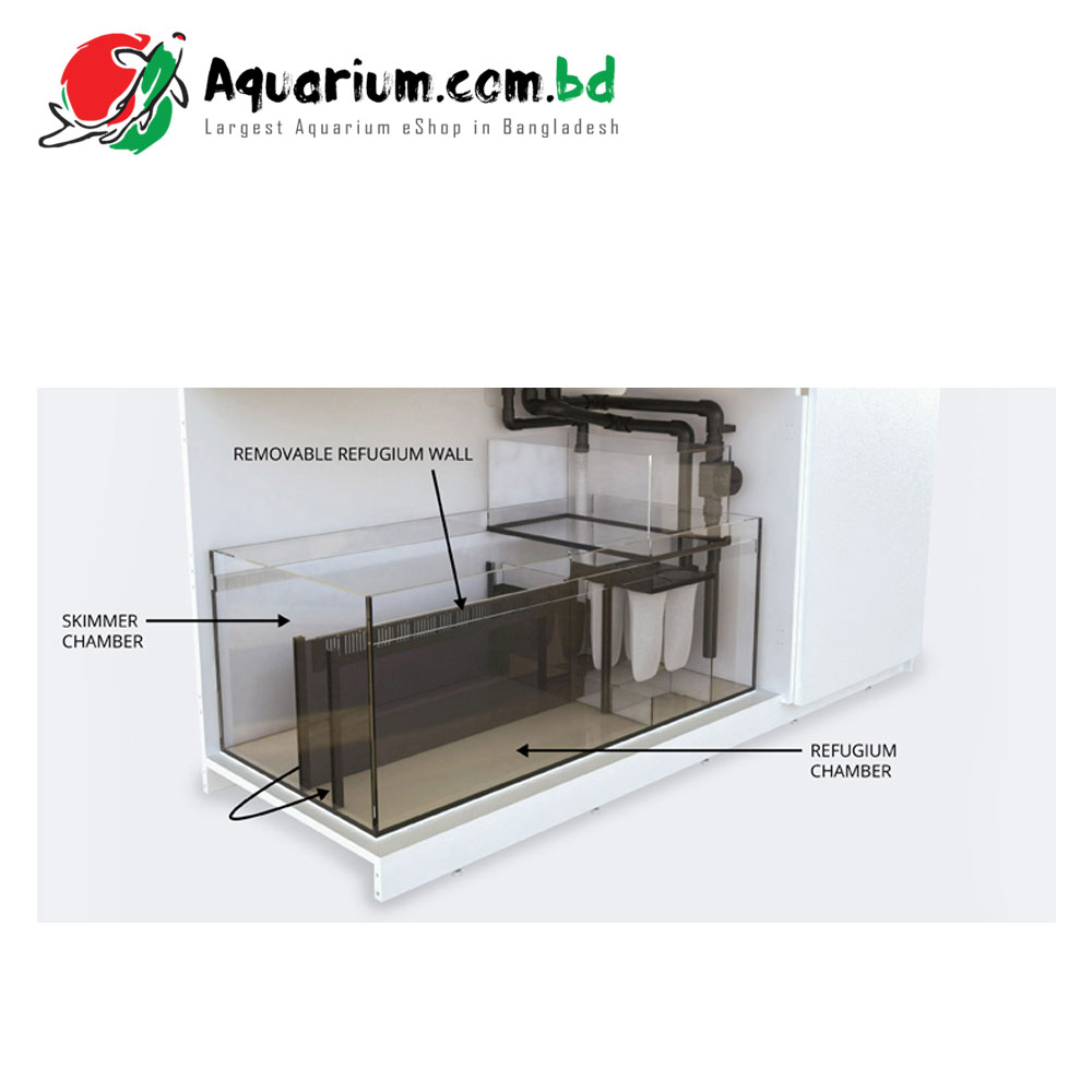 The sump includes a filter sock holder and sock to keep large pieces of debris and detritus from clogging pumps and other pieces of equipment. The water can then flow from the filter sock into the skimmer compartment where the water will keep a steady level to aid in the best performance in your choice of skimmer or any other filtration components that you choose to include can be placed there. The water will then flow through the final bubble trap and in to the final chamber where the return pump (not included) can be placed to pump water back through the Reefer tanks return plumbing.